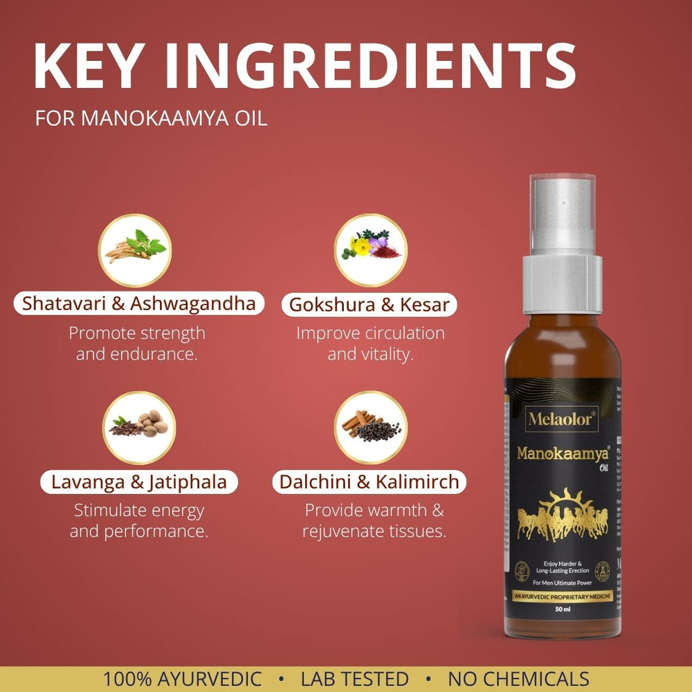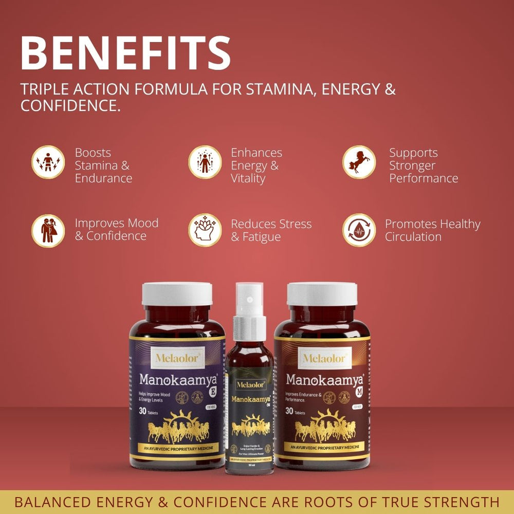 Melaolor Manokaamya is a complete 3-step Ayurvedic formula created for men seeking natural enhancement of vitality, stamina, and overall performance.