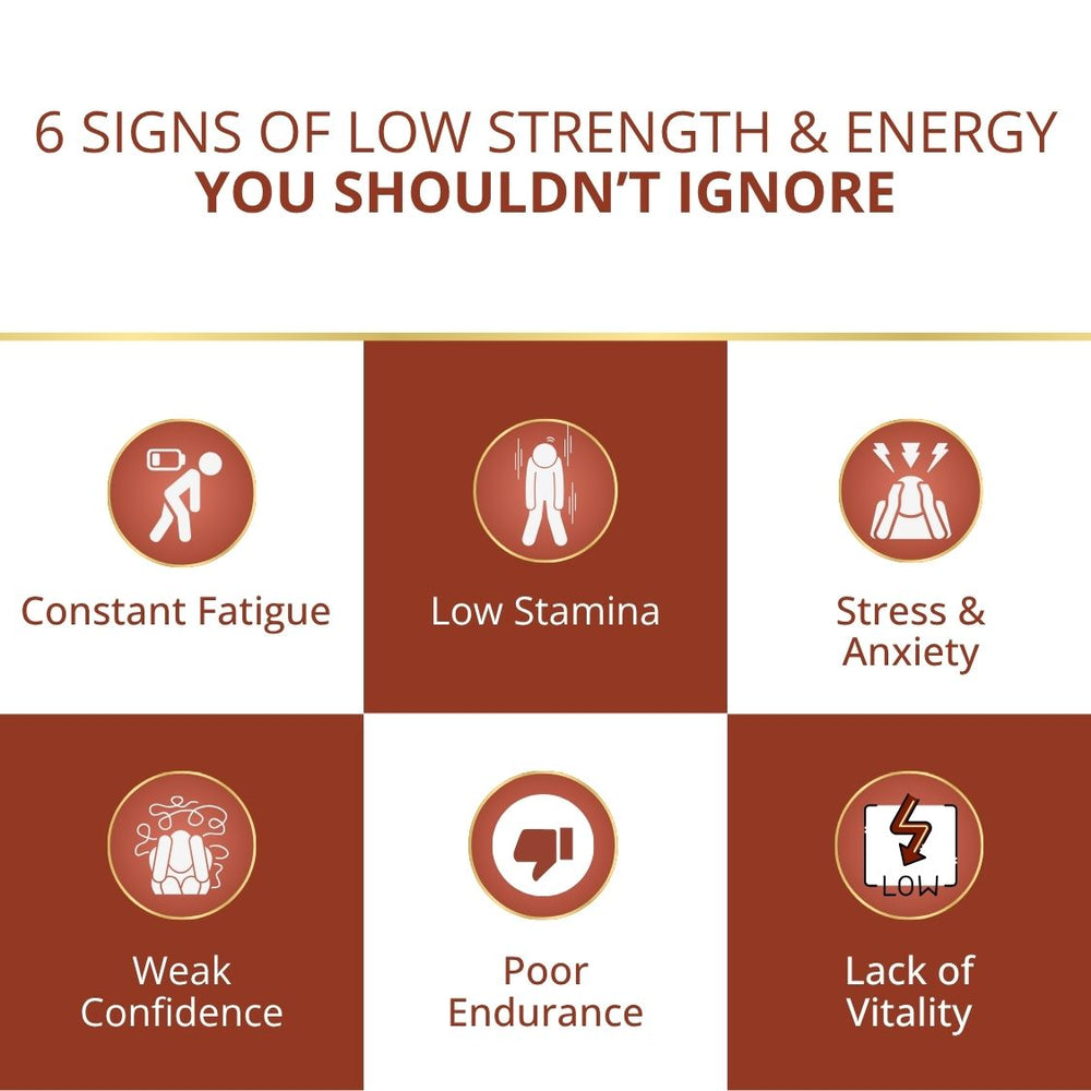 Gokshura & Shilajit: Rejuvenate strength, stamina and recovery.