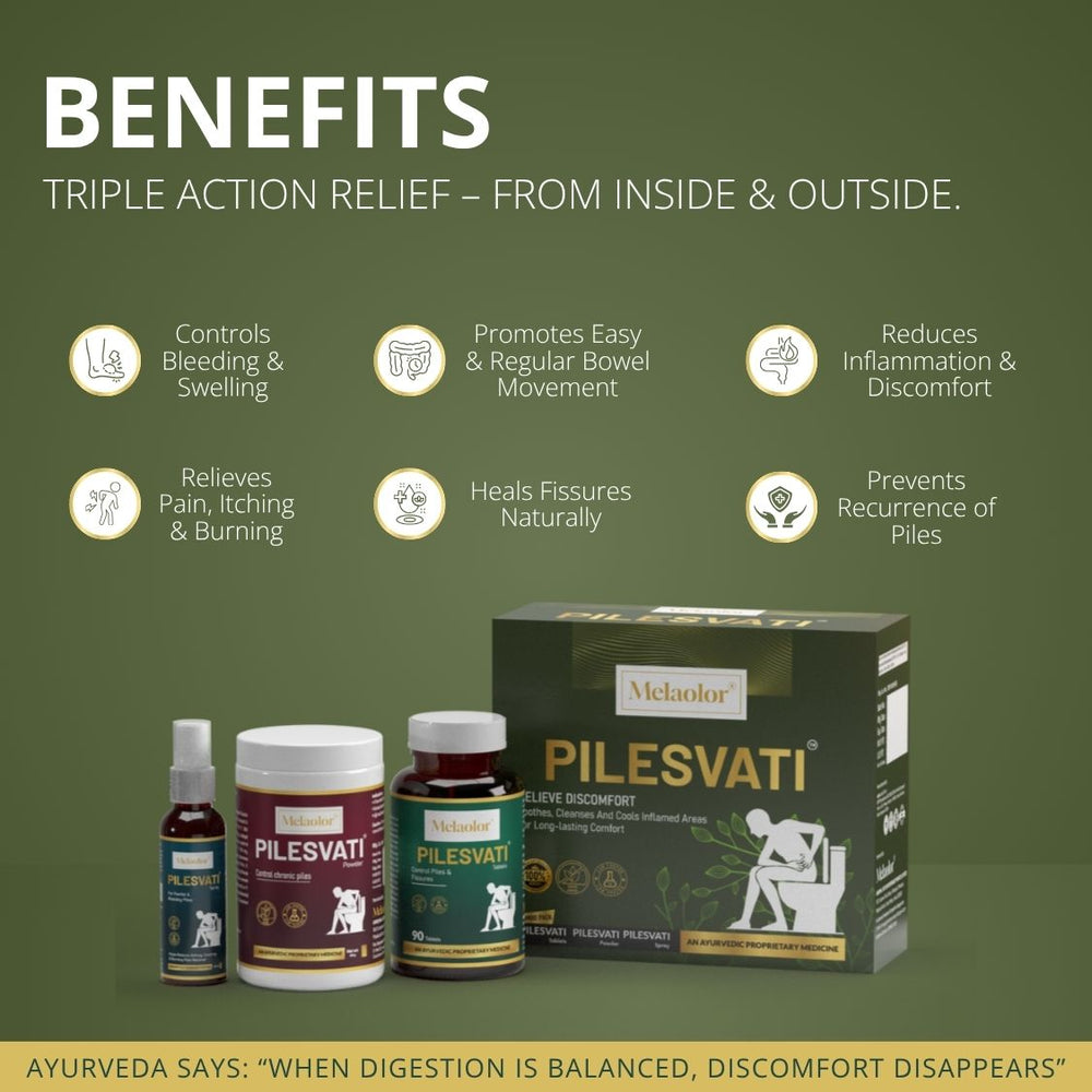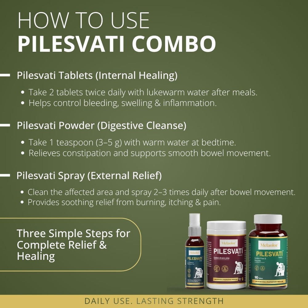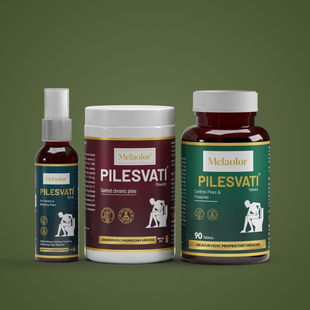 Melaolor Pilesvati is a complete 3-step Ayurvedic treatment designed to provide fast, natural, and long-lasting relief from piles, fissures, and constipation.