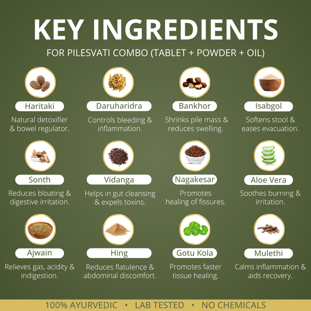 It combines the power of Pilesvati Tablets, Pilesvati Powder, and Pilesvati Spray — working together to heal internally, cleanse the digestive system, and soothe externally.